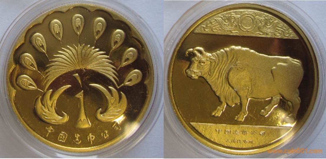 1985年制造,黃銅鍍金精制33mm,上幣發(fā)行。正面為牛,反面為孔雀。