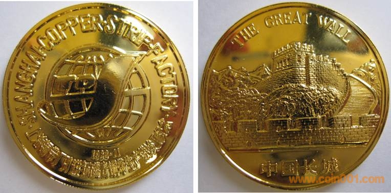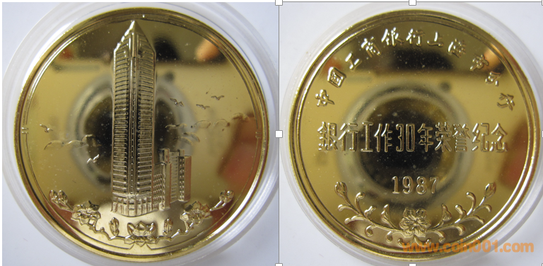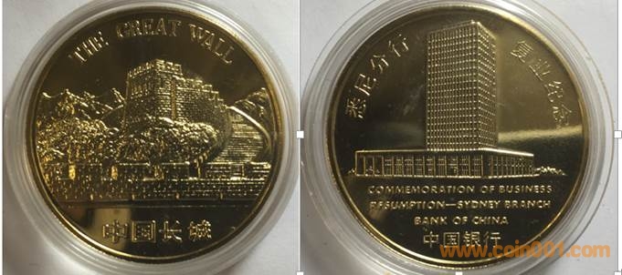 1986年制造,黃銅普制鍍金36mm上幣發(fā)行。正面為中國長城,反面為銀行大樓。