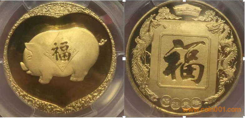 1983年制造,黃銅精制鍍金33mm上幣發(fā)行。正面為福字,反面為豬。