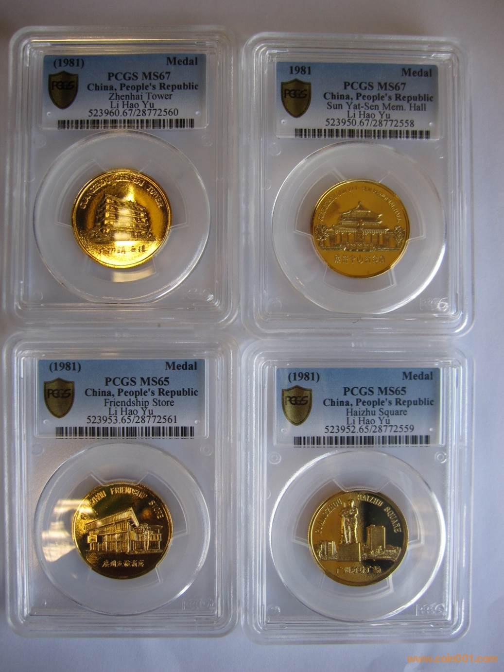 80年代制造,黃銅普制鍍金27mm上幣發(fā)行。正面為五羊雕塑,反面為廣州友誼商店、珠海廣場、鎮(zhèn)海樓及中山紀念堂。一套6000-12000