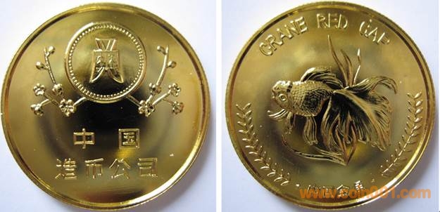 80年代制造,黃銅普制鍍金27mm上幣發(fā)行。正面為中國造幣公司圖標,反面為金魚。此章為造幣廠試樣章。