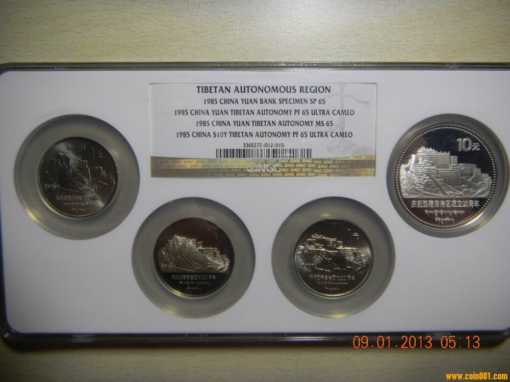 NGC評級老西藏同分大全套,共計4枚,分別為樣幣、精制幣、普制幣、銀幣各一枚,全部為65分,其中樣幣分數(shù)的標簽為"SP",大家應該熟悉,現(xiàn)在樣幣的標簽都為MS,只是在MS前標明SPECIMEN,所以在分數(shù)前標明SP的已經(jīng)沒有了,這套也是本人早期評的,先把4枚單獨評,湊成同是65分后再次郵寄到美國打成多幣,其中往來的費用及時間成本大家可以自己計算一下。這4枚已經(jīng)把老西藏不同的材質全部封到一個盒子中,而且分數(shù)相同,雖然65分低了些,可是樣幣評高分難評,為了與樣幣湊成同分,本人才找了其他同是65分的三枚老西藏。樣幣難求、不同材質同分而且能打到一個盒子中的更難求。