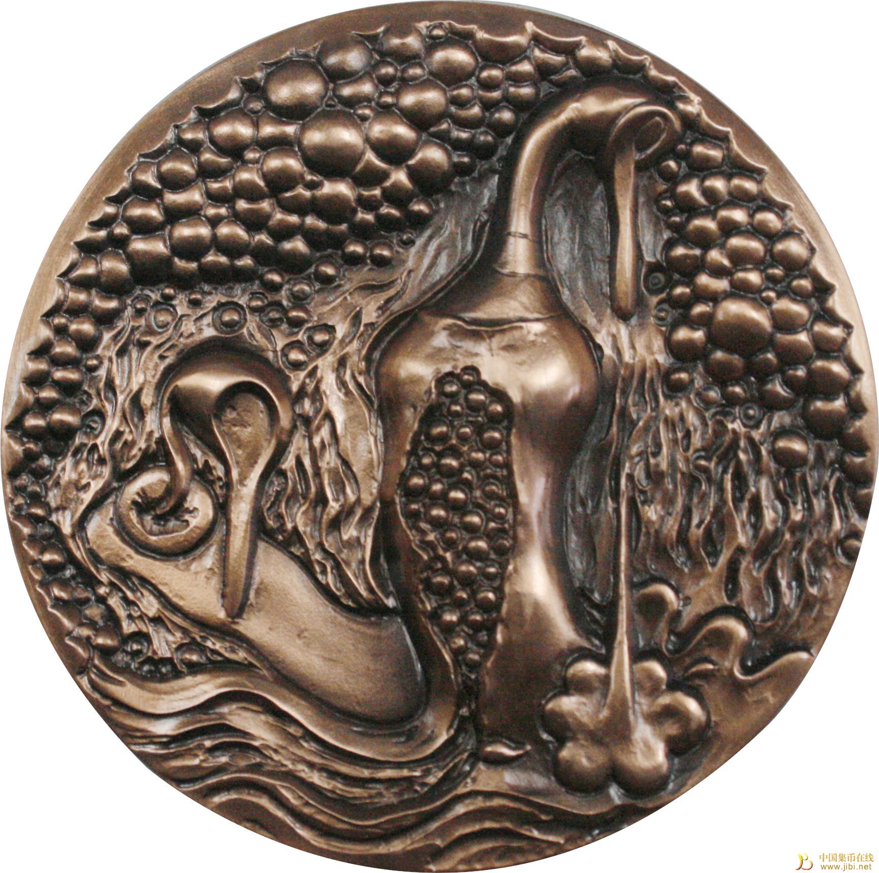 “酒吧”系列大銅章一組兩枚,“酒吧”(一)大銅章,正面圖案:酒吧一角符號(hào)化、性征化的醉酒男女特寫(xiě),背景為噪雜的人群影像和鋪天蓋地的酒瓶;背面圖案:為正面圖案的虛幻表達(dá)?!熬瓢伞保ǘ┐筱~章,正面圖案:以細(xì)膩而真實(shí)的筆觸再現(xiàn)了酒吧里一對(duì)緊緊相擁的年輕人;背面圖案:為正面圖案的虛幻表達(dá)。
