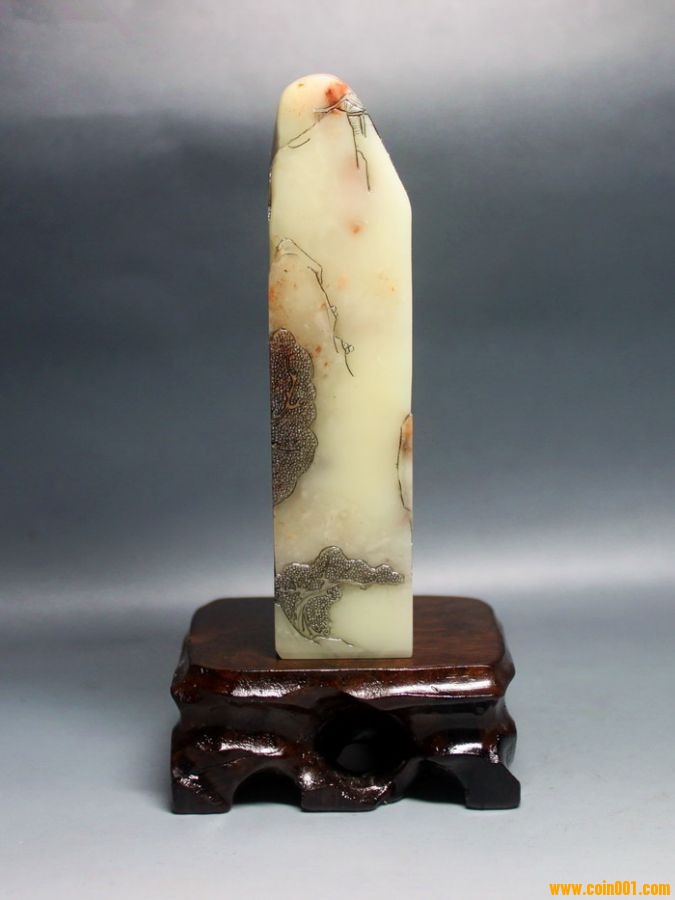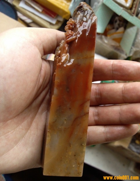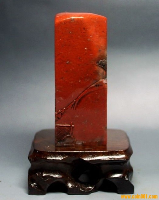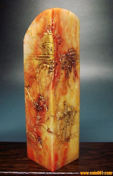 (2)壽山石印章之高山凍石山水人物薄意大章,沒(méi)有缺陷,章高:13.0公分,章面:2.9公分*2.9公分,這么大的尺寸很難得;壽山石之高山凍石,質(zhì)地很好,很大面積帶有凍質(zhì),非常難得;石性穩(wěn)定,手工雕刻,雕工不錯(cuò),三包天然壽山石,包石頭天然原色;刻劃人物傳神,石質(zhì)溫潤(rùn)熟美,章料彰顯大氣,文雅之士必備用品,價(jià)格:980元,具體圖片請(qǐng)看二樓的圖片,圖片是在晚上燈光下拍的,顏色顯得亮,實(shí)物紅色部分的顏色是深紅色。