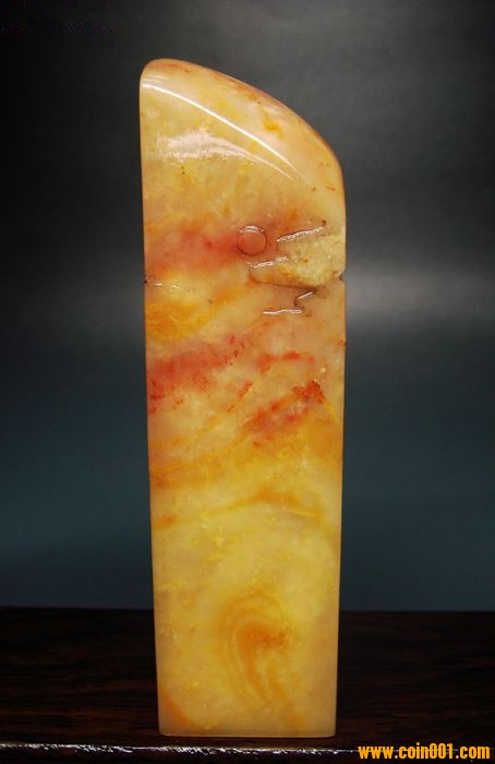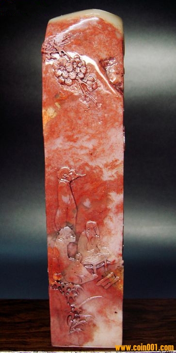 (5)壽山石精雕印章之山居訪友人物長(zhǎng)形大章,沒(méi)有缺陷,印章高約13.2公分,印面長(zhǎng)寬2.7公分,這么大的尺寸很難得;壽山高山系材質(zhì),紅黃白灰俏色鏟雕技藝精湛,刻劃人物傳神,石質(zhì)溫潤(rùn)熟美,章料彰顯大氣,文雅之士必備用品,質(zhì)地很好,色澤漂亮,石性穩(wěn)定,手工雕刻,三包天然壽山石,包石頭天然原色,價(jià)格:880元,具體圖片請(qǐng)看五樓的圖片。