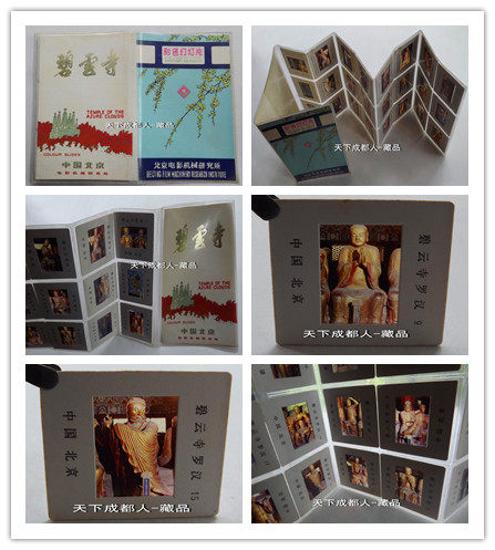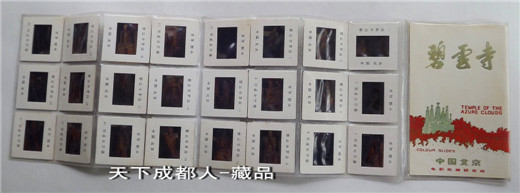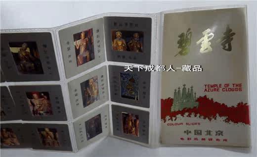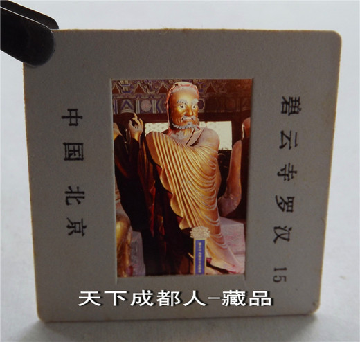 (長35*寬22毫米)、各卡片正背面分別刊“碧云寺羅漢、中國北京及編號”中英文字樣;原外塑冊內(nèi)分別展示“碧云寺羅漢堂-各神態(tài)各異木質(zhì)漆金羅漢”,各幻燈片清晰、莊重高雅、保持完好;具有較高鑒賞趣味價值,