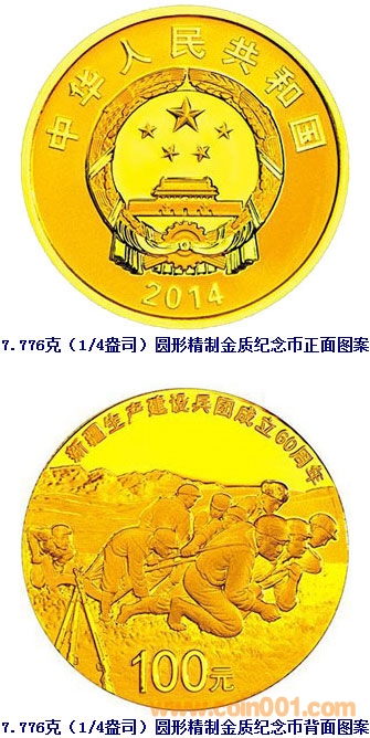 中國人民銀行定于2014年6月30日發(fā)行新疆生產(chǎn)建設(shè)兵團(tuán)成立60周年金銀紀(jì)念幣一套。該套紀(jì)念幣共3枚,其中金幣1枚,銀幣2枚,均為中華人民共和國法定貨幣。