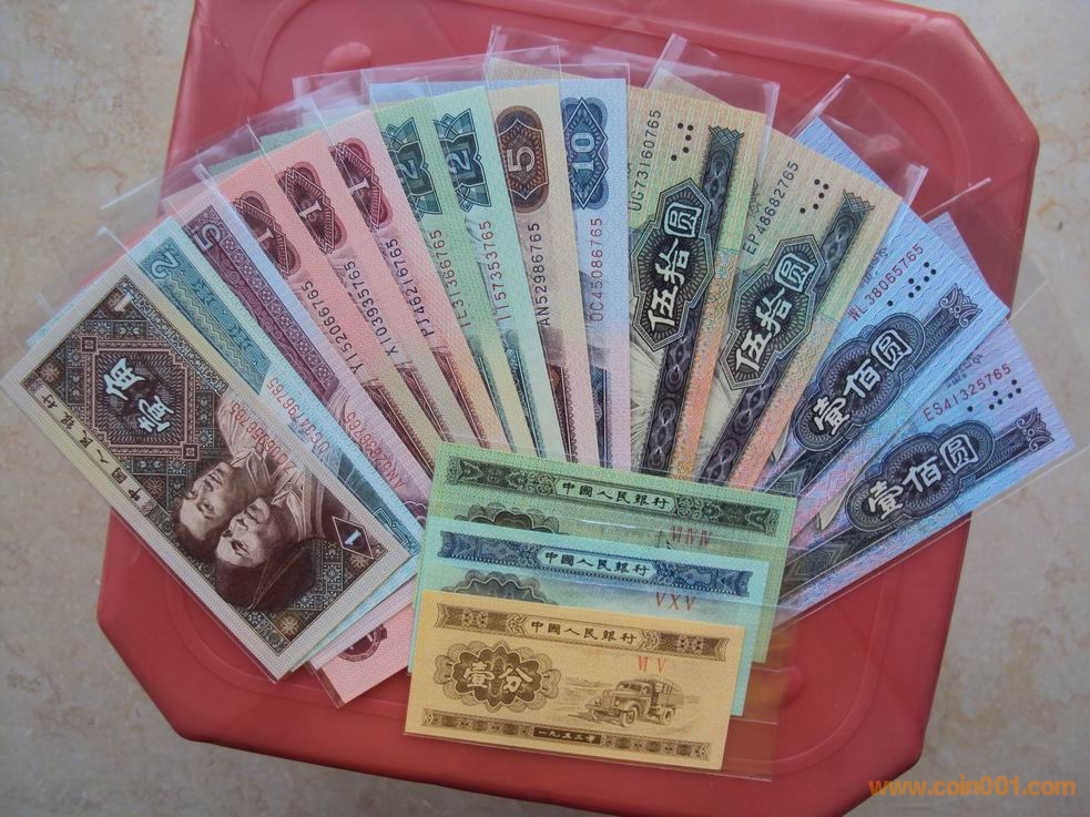 備注:1)80版+90版100元?jiǎng)桓饕幻叮唬?)80版+90版50元?jiǎng)桓饕幻叮?0版50元(第四人民幣鈔王,罕見)(3)80版10元?jiǎng)灰幻叮唬?)80版5元?jiǎng)灰幻?;?)80版+90版2元?jiǎng)桓饕幻?;?)80版+90版+96版1元?jiǎng)桓饕幻?;?)80版五角劵一枚;(8)80版兩角劵一枚;(9)80版一角劵一枚;(10)紙分幣三張.最大特點(diǎn):中國人民銀行發(fā)行的第四套人民幣全套九種劵別“末三位”數(shù)字編號(hào)全部相同 |