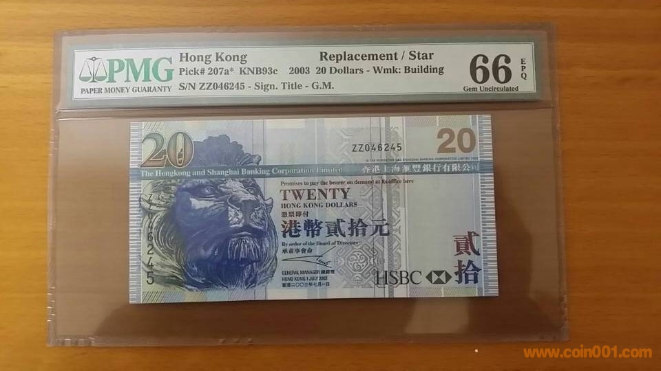2003年 ,香港上海匯豐銀行,貳拾元,補(bǔ)版,ZZ,046245,PMG,66,EPQ      300元
