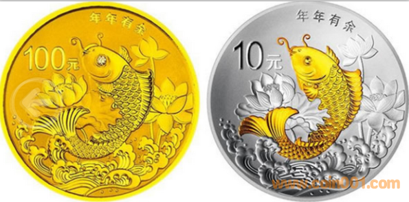 7.776克(1/4盎司)圓形金質(zhì)紀(jì)念幣背面圖案為蓮花、鯉魚等造型組合設(shè)計(jì),并刊“年年有余”字樣及面額。