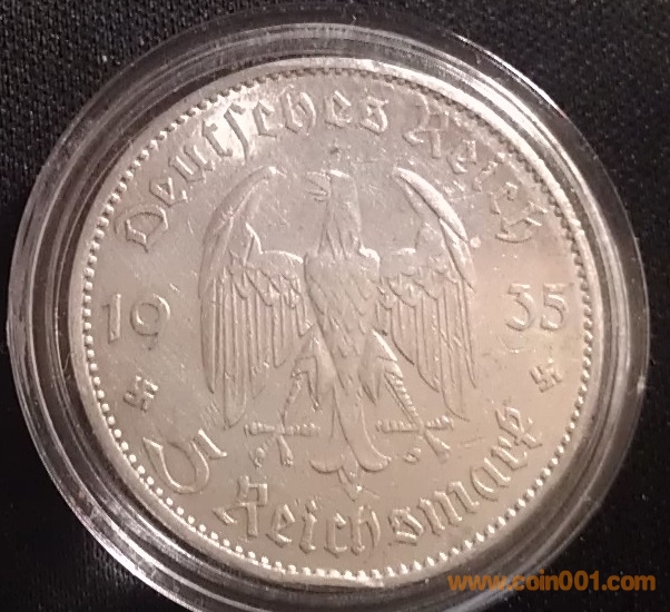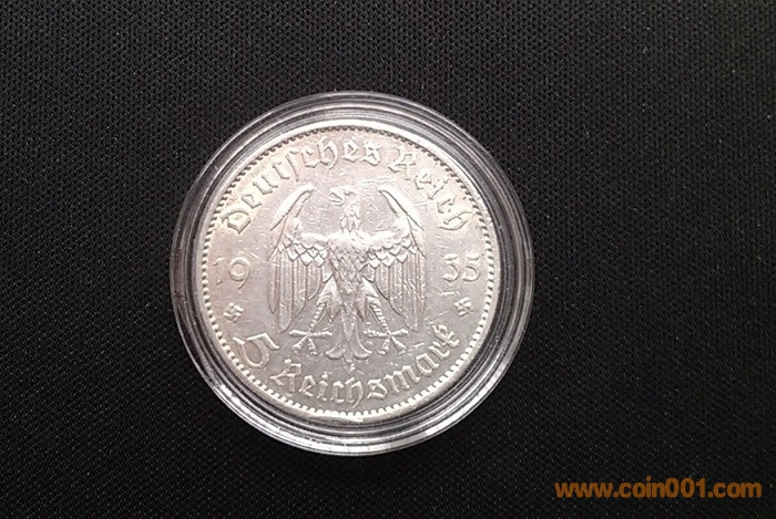 直徑29.0mm,重量13.88Grams,含銀量90.0 %。1935年發(fā)行,面值5馬克,稀少品種,紀(jì)念納粹上臺(tái)一周年,鑄造量遠(yuǎn)小于后來(lái)的1936-1938年5馬克銀幣,正面有兩個(gè)納粹標(biāo)志,絕對(duì)保真,送塑料小圓盒。 納粹黨自1933年開始執(zhí)政,1934年開始發(fā)行印有納粹標(biāo)志的銀幣,直至1936年才開始大量發(fā)行具有明顯納粹標(biāo)志的硬幣,帝國(guó)戰(zhàn)鷹握住萬(wàn)字花環(huán)的標(biāo)志出現(xiàn)在正面。1939年二戰(zhàn)正式爆發(fā)后,戰(zhàn)爭(zhēng)資源緊張,再也沒有鑄造過大面額的納粹馬克銀幣。小面額芬尼硬幣也停止使用superior metals鑄造。1940年以后,幾乎所有的小面額硬幣都以鋅為主要鑄造金屬,唯一的例外是50芬尼硬幣,仍以鋁為主要鑄造金屬。絕大多數(shù)帶有納粹標(biāo)志 銅、鋅、鋁硬幣,在戰(zhàn)后,又被收繳,重新送回鑄幣廠,在它們被鑄造的地方,被回爐銷毀。再加上大量的硬幣,在戰(zhàn)亂中即被損毀,所以存世量不大,具有收藏和歷史研究?jī)r(jià)值.