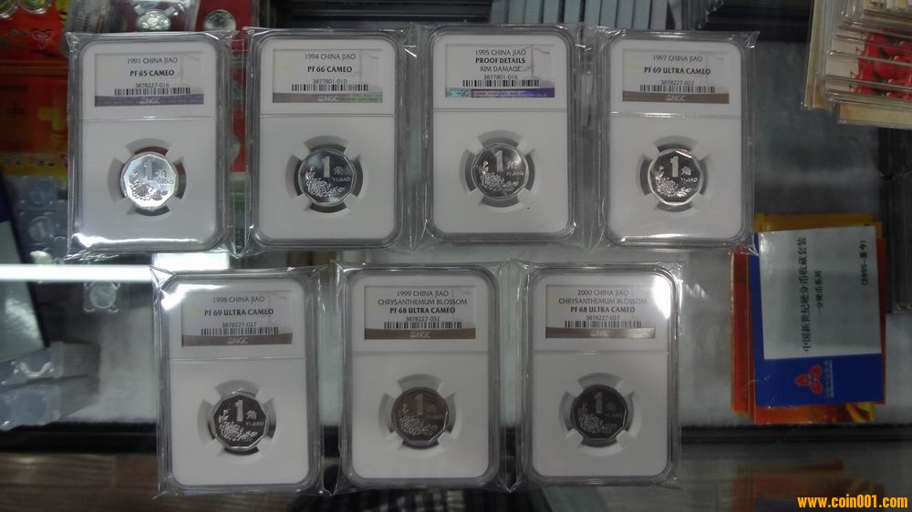 出售NGC評級(精制91,94,95,97,98,99,00)菊花1角,1991年(65分)200元,1994年(66分)350元,1999年(無分)150元,1997年(69分)1400元,1998年(69分)1400元,1999年(68分)600元,2000年(68分)1600元。