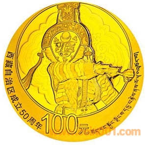 7.776克(1/4盎司)圓形金質(zhì)紀(jì)念幣背面圖案為藏戲表演藝術(shù)造型,襯以傳統(tǒng)吉祥紋飾組合設(shè)計(jì),并刊“西藏自治區(qū)成立50周年”漢、藏文字樣及面額。