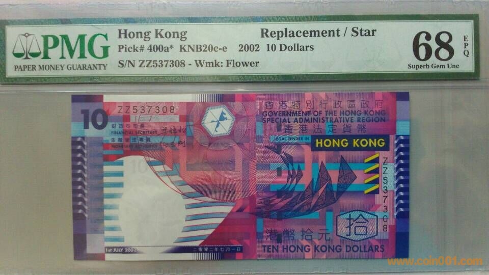 【PMG,68,EPQ】2002年,香港特別行政區(qū)港幣拾元,ZZ補(bǔ)號,ZZ537308,售價:980元