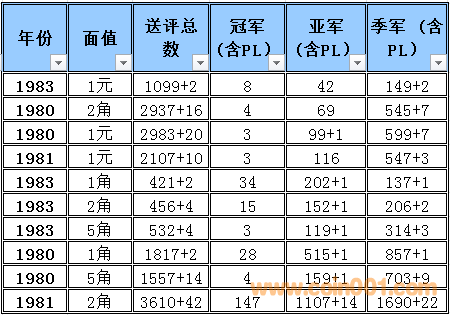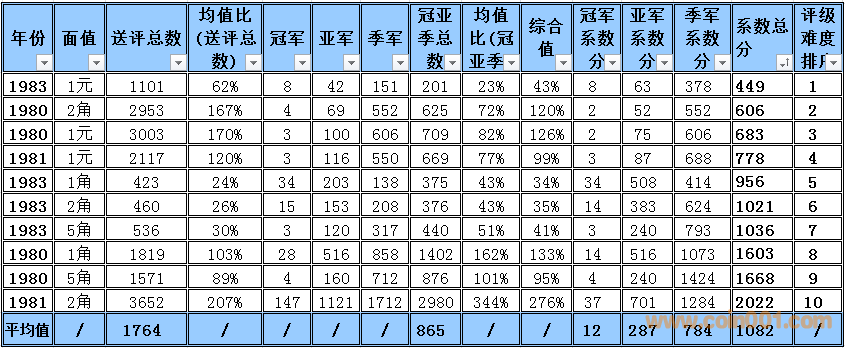 普制長城幣評級難度排序2015-9 普制長城幣評級難度排序與早期分幣難度排序有明顯的區(qū)別,為了能體現(xiàn)難度系數(shù)的準(zhǔn)確性和科學(xué)性在計算時考慮的因素相對要復(fù)雜一些,主要參考了評級的總數(shù),均值比(送評總數(shù)),冠亞季軍總數(shù),均值比(冠亞季總數(shù))等數(shù)據(jù)作為計算的主要依據(jù),同時各個均值段的補(bǔ)償方法也比較復(fù)雜 首先我們需要討論評級幣的價格構(gòu)成評級幣的價格構(gòu)成 裸幣的價格+評級溢價+評級費(fèi)用=評級幣的參考價格 主要可以參考以下2個因數(shù), 第一個因素為裸幣本生的價格(它的價格變動主要依據(jù)裸幣成交價格的變動而變動與評級溢價之間的關(guān)系不大) 舉例來說: 裸幣的價格上漲1倍評級難度系數(shù)沒有變化的話,評級幣的價格應(yīng)該相應(yīng)的上漲1倍+溢價+評級費(fèi)用=評級幣的參考價格,裸幣的價格的上漲只能帶動評級幣裸幣部分的上升,裸幣價格下跌,評級難度系數(shù)沒有變化的話,評級幣的價格為裸幣下跌的價格+溢價+評級費(fèi)用=評級幣的參考價格,裸幣的價格的下跌只能帶動評級幣裸幣部分的下跌 第二個因素為評級難度所產(chǎn)生的一個溢價難度系數(shù)越高它對應(yīng)的溢價就越高。溢價變化主要依據(jù)評級難度系數(shù)與系數(shù)平均值的變化和對比來決定,溢價水平的上升在一定的程度上會提升高品質(zhì)裸幣的價格(卷光卷拆的硬幣)和品相的稀缺性,裸幣價格的下跌,如果評級難度提高的話評級幣的價格反而有可能會上升,從以上的結(jié)果可以得出下列結(jié)論,溢價是評級價格體系當(dāng)中最重要的組成部分,溢價和裸幣的價格體系完全是獨(dú)立的,之間的價格沒有直接的聯(lián)系 備注:關(guān)于這個數(shù)據(jù)的準(zhǔn)確性在設(shè)計這個表的時候我已經(jīng)考慮到了一個重評的可能性所以我只取冠,亞,季軍作為一個參考并同時設(shè)計了一個補(bǔ)償方案,重評從時間和金錢的角度來衡量的話不是非常經(jīng)濟(jì)且還存在一定的風(fēng)險,但是從長遠(yuǎn)看不能排除這個因數(shù)。雖然將來會產(chǎn)生一些誤差,但我認(rèn)為誤差不會太大尤其在高分段和稀缺性的錢幣,對于普制長城幣來說NGC已經(jīng)作為收藏的主流其數(shù)據(jù)的準(zhǔn)確性還是比較值得信賴的。 采樣的范圍取樣范圍:1980-1985 普制長城幣難度排序的選擇標(biāo)準(zhǔn):送評總數(shù)的平均值高于100%的普制長城幣,低于100%的數(shù)據(jù)將不體現(xiàn)在難度排序中 計算公式: 評級總數(shù)/均值=均值比考慮到1983年長城幣存世量明顯低于其他年份的普制長城幣,1983年的數(shù)據(jù)將保留和計入到難度排序中,大家可以通過下面的圖表黃色部分發(fā)現(xiàn)被刪除的年份主要是送評溢價不高的年份,如果未來送評量穩(wěn)步上升的話,它將加入到采樣的范圍.備:這個采樣的范圍會有一定的誤差,我將根據(jù)均值比的變化每個季度第一周進(jìn)行適當(dāng)?shù)恼{(diào)整,由于普制長城幣的版別比較復(fù)雜,無法進(jìn)行細(xì)分這里主要以年份為主,請大家諒解! 采樣的數(shù)據(jù)和計算的依據(jù)統(tǒng)計第一檔次每個年份冠,亞,季的出分?jǐn)?shù)量作為一個分析依據(jù),為了能更加的量化我用數(shù)字的方法進(jìn)行統(tǒng)計,方法如下:調(diào)整后的均值比 普制長城幣的計算方法如下:綜合值的計算方法:(送評總數(shù)均值比+冠亞季總數(shù)均值比)÷2=綜合值具體計算方法如下:均值比在0-50%冠軍分1枚為1分2枚2分以此類推,亞軍分1枚為2分2枚4分以此類推,季軍1枚為3分2枚6分以此類推補(bǔ)償方法如下:如果冠軍分的評分?jǐn)?shù)量大于總數(shù)(冠,亞,季之和)的15%,冠軍分的1枚為1.5分,如果冠軍分的評分?jǐn)?shù)量大于總數(shù)(冠,亞,季之和)的50%冠軍分的1枚為2分如果亞軍分的評分?jǐn)?shù)量大于總數(shù)(冠,亞,季之和)的35%,亞軍分的1枚為2.5分,如果亞軍分的評分?jǐn)?shù)量低于總數(shù)(冠,亞,季之和)的25%亞軍分的1枚為1.5分季軍分的評分?jǐn)?shù)量大于總數(shù)(冠,亞,季之和)的65%,季軍分的1枚為2.5分, 季軍分的評分?jǐn)?shù)量大于總數(shù)(冠,亞,季之和)的85%,季軍分的1枚為2分 均值比在50-100%冠軍分1枚為1分2枚2分以此類推,亞軍分1枚為1.5分2枚3分以此類推,季軍1枚為2分2枚4分以此類推此范圍+值補(bǔ)償如果冠軍分的評分?jǐn)?shù)量大于總數(shù)(冠,亞,季之和)的50%冠軍分的1枚為1.25分如果亞軍分的評分?jǐn)?shù)量大于總數(shù)(冠,亞,季之和)的35%,亞軍分的1枚為1.75分 均值比在100-150%冠軍分1枚為0.5分2枚1分以此類推,亞軍分1枚為1分2枚2分以此類推,季軍1枚為1.5分2枚3分以此類推補(bǔ)償方法如下:如果冠軍分的評分?jǐn)?shù)量大于總數(shù)(冠,亞,季之和)的15%,冠軍分的1枚為0.75分,如果冠軍分的評分?jǐn)?shù)量大于總數(shù)(冠,亞,季之和)的50%冠軍分的1枚為1分如果亞軍分的評分?jǐn)?shù)量大于總數(shù)(冠,亞,季之和)的35%,亞軍分的1枚為1.25分,如果亞軍分的評分?jǐn)?shù)量低于總數(shù)(冠,亞,季之和)的25%亞軍分的1枚為0.75分季軍分的評分?jǐn)?shù)量大于總數(shù)(冠,亞,季之和)的65%,季軍分的1枚為1.25分, 季軍分的評分?jǐn)?shù)量大于總數(shù)(冠,亞,季之和)的85%,季軍分的1枚為1分 均值比在150%-180%冠軍分1枚為0.5分2枚1