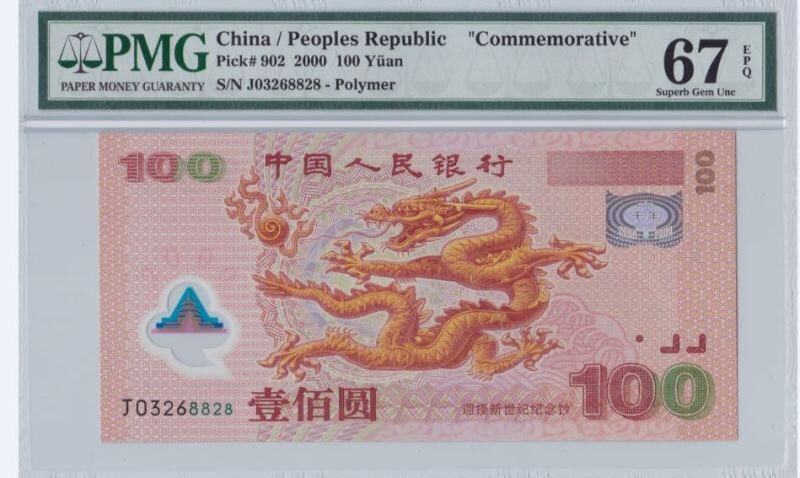 2000年龍鈔無四七10連PMG評(píng)級(jí)幣:J03268821-8830 10張全部67EPQ 33333元PMG航天鈔首期評(píng)級(jí):J2353901668 66EPQ 500元PMG建國鈔:J19121518 68EPQ 1950元