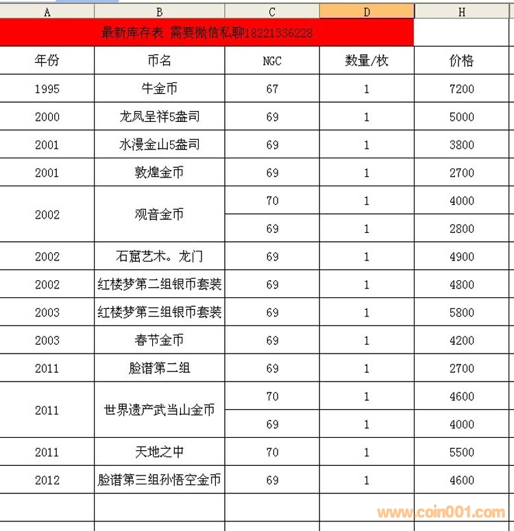 1995年牛金幣、龍鳳呈祥、水漫金山、敦煌金幣、觀音金幣、龍門、紅樓夢、春節(jié)金幣、臉譜、世界遺產武當山、天地之中、
