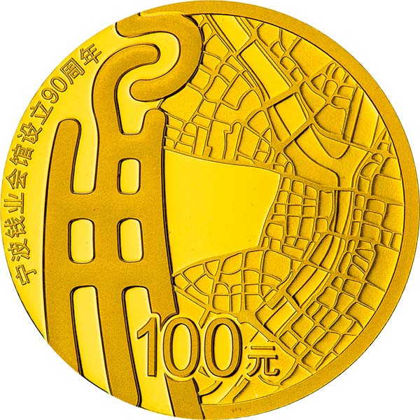 8克圓形金質(zhì)紀念幣背面圖案為“甬”字造型,配以寧波三江口俯視圖形組合設(shè)計,并刊“寧波錢業(yè)會館設(shè)立90周年”字樣及面額。