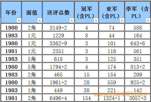 普制長城幣評級難度排序2016-3 (全新改版) 普制長城幣評級難度排序與早期分幣難度排序有明顯的區(qū)別,為了能體現(xiàn)難度系數(shù)的準(zhǔn)確性和科學(xué)性在計算時考慮的因素相對要復(fù)雜一些,主要參考了評級的總數(shù),均值比(送評總數(shù)),冠亞季軍總數(shù),均值比(冠亞季總數(shù))等數(shù)據(jù)作為計算的主要依據(jù),同時各個均值段的補(bǔ)償方法也比較復(fù)雜 首先我們需要討論評級幣的價格構(gòu)成評級幣的價格構(gòu)成 裸幣的價格+評級溢價+評級費(fèi)用=評級幣的參考價格 主要可以參考以下2個因數(shù), 第一個因素為裸幣本生的價格(它的價格變動主要依據(jù)裸幣成交價格的變動而變動與評級溢價之間的關(guān)系不大) 舉例來說: 裸幣的價格上漲1倍評級難度系數(shù)沒有變化的話,評級幣的價格應(yīng)該相應(yīng)的上漲1倍+溢價+評級費(fèi)用=評級幣的參考價格,裸幣的價格的上漲只能帶動評級幣裸幣部分的上升,裸幣價格下跌,評級難度系數(shù)沒有變化的話,評級幣的價格為裸幣下跌的價格+溢價+評級費(fèi)用=評級幣的參考價格,裸幣的價格的下跌只能帶動評級幣裸幣部分的下跌 第二個因素為評級難度所產(chǎn)生的一個溢價難度系數(shù)越高它對應(yīng)的溢價就越高。溢價變化主要依據(jù)評級難度系數(shù)與系數(shù)平均值的變化和對比來決定,溢價水平的上升在一定的程度上會提升高品質(zhì)裸幣的價格(卷光卷拆的硬幣)和品相的稀缺性,裸幣價格的下跌,如果評級難度提高的話評級幣的價格反而有可能會上升,從以上的結(jié)果可以得出下列結(jié)論,溢價是評級價格體系當(dāng)中最重要的組成部分,溢價和裸幣的價格體系完全是獨立的,之間的價格沒有直接的聯(lián)系 備注:關(guān)于這個數(shù)據(jù)的準(zhǔn)確性在設(shè)計這個表的時候我已經(jīng)考慮到了一個重評的可能性所以我只取冠,亞,季軍作為一個參考并同時設(shè)計了一個補(bǔ)償方案,重評從時間和金錢的角度來衡量的話不是非常經(jīng)濟(jì)且還存在一定的風(fēng)險,但是從長遠(yuǎn)看不能排除這個因數(shù)。雖然將來會產(chǎn)生一些誤差,但我認(rèn)為誤差不會太大尤其在高分段和稀缺性的錢幣,對于普制長城幣來說NGC已經(jīng)作為收藏的主流其數(shù)據(jù)的準(zhǔn)確性還是比較值得信賴的。 采樣的范圍取樣范圍:1980-1985 普制長城幣難度排序的選擇標(biāo)準(zhǔn):送評總數(shù)的平均值高于100%的普制長城幣,低于100%的數(shù)據(jù)將不體現(xiàn)在難度排序中 計算公式: 評級總數(shù)/均值=均值比考慮到1983年長城幣存世量明顯低于其他年份的普制長城幣,1983年的數(shù)據(jù)將保留和計入到難度排序中,大家可以通過下面的圖表黃色部分發(fā)現(xiàn)被刪除的年份主要是送評溢價不高的年份,如果未來送評量穩(wěn)步上升的話,它將加入到采樣的范圍.備:這個采樣的范圍會有一定的誤差,我將根據(jù)均值比的變化每個季度第一周進(jìn)行適當(dāng)?shù)恼{(diào)整,由于普制長城幣的版別比較復(fù)雜,無法進(jìn)行細(xì)分這里主要以年份為主,請大家諒解! 采樣的數(shù)據(jù)和計算的依據(jù)統(tǒng)計第一檔次每個年份冠,亞,季的出分?jǐn)?shù)量作為一個分析依據(jù),為了能更加的量化我用數(shù)字的方法進(jìn)行統(tǒng)計,方法如下:調(diào)整后的均值比 普制長城幣的計算方法如下:綜合值的計算方法:(送評總數(shù)均值比+冠亞季總數(shù)均值比)÷2=綜合值具體計算方法如下:均值比在0-50%冠軍分1枚為1分2枚2分以此類推,亞軍分1枚為2分2枚4分以此類推,季軍1枚為3分2枚6分以此類推補(bǔ)償方法如下:如果冠軍分的評分?jǐn)?shù)量大于總數(shù)(冠,亞,季之和)的15%,冠軍分的1枚為1.5分,如果冠軍分的評分?jǐn)?shù)量大于總數(shù)(冠,亞,季之和)的50%冠軍分的1枚為2分如果亞軍分的評分?jǐn)?shù)量大于總數(shù)(冠,亞,季之和)的35%,亞軍分的1枚為2.5分,如果亞軍分的評分?jǐn)?shù)量低于總數(shù)(冠,亞,季之和)的25%亞軍分的1枚為1.5分 均值比在50-100%冠軍分1枚為1分2枚2分以此類推,亞軍分1枚為1.5分2枚3分以此類推,季軍1枚為2分2枚4分以此類推此范圍+值補(bǔ)償如果冠軍分的評分?jǐn)?shù)量大于總數(shù)(冠,亞,季之和)的50%冠軍分的1枚為1.25分如果亞軍分的評分?jǐn)?shù)量大于總數(shù)(冠,亞,季之和)的35%,亞軍分的1枚為1.75分 均值比在100-150%冠軍分1枚為0.5分2枚1分以此類推,亞軍分1枚為1分2枚2分以此類推,季軍1枚為1.5分2枚3分以此類推補(bǔ)償方法如下:如果冠軍分的評分?jǐn)?shù)量大于總數(shù)(冠,亞,季之和)的15%,冠軍分的1枚為0.75分,如果冠軍分的評分?jǐn)?shù)量大于總數(shù)(冠,亞,季之和)的50%冠軍分的1枚為1分如果亞軍分的評分?jǐn)?shù)量大于總數(shù)(冠,亞,季之和)的35%,亞軍分的1枚為1.25分,如果亞軍分的評分?jǐn)?shù)量低于總數(shù)(冠,亞,季之和)的25%亞軍分的1枚為0.75分 均值比在150%-180%冠軍分1枚為0.5分2枚1分以此類推,亞軍分1枚為0.75分2枚1.5分以此類推,季軍1枚為1.25分2枚2.5分以此類推如果冠軍分的評分?jǐn)?shù)量大于總數(shù)(冠,亞,季之和)的15%,冠軍分的1枚為0.62分,如果冠軍分的評分?jǐn)?shù)量大于總數(shù)(冠,亞,季之和)的50%冠軍分的1枚為0.75分如果亞軍分的評分?jǐn)?shù)量大于總數(shù)(冠,亞,季之和)