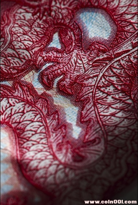 2、雙色凹印技術----正面的主景龍圖案和“壬辰”字樣采用紅色凹印油墨,左下側團花和“2012”字樣以及盲文點采用藍色凹印油墨。