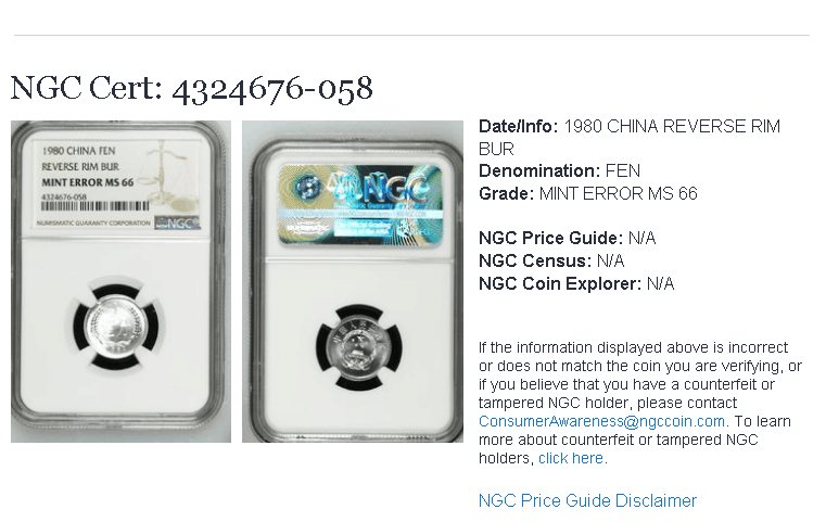 引用 引用第3樓七彩fish于2016-05-20 09:14發(fā)表的 :NGC對(duì)錯(cuò)幣,不計(jì)入該幣的統(tǒng)計(jì)數(shù)量的,所以不顯示數(shù)量NGC對(duì)錯(cuò)幣評(píng)級(jí),主要是判斷是不是人為以及判斷錯(cuò)幣的錯(cuò)誤類(lèi)型,分?jǐn)?shù)根據(jù)該幣正常部分的狀態(tài),比照正常幣的品相給分。