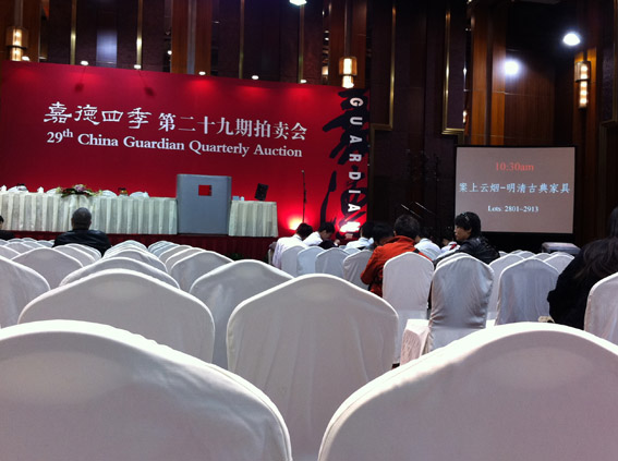 2012嘉德四季第29期拍賣會-明清古典家具和書畫的專場拍賣,這兩個拍賣在兩個廳同時舉槌。明清古典家具的拍賣現(xiàn)場坐無缺席,還有在后面加椅子或者站著的,而書畫的拍賣現(xiàn)場有很多空位。參加家具的拍賣人氣遠遠大于書畫的拍賣。