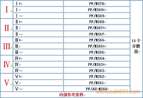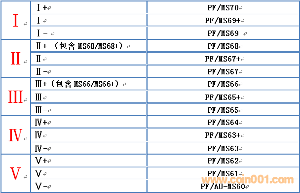 舉例:評級公司給予69分,理論上存在3種可能,分別為MS69+,MS69,MS69-,由于采用了逢減必降的原則,MS69-沒有歸類到Ⅰ等級,而是歸納到了Ⅱ+,并依次類推