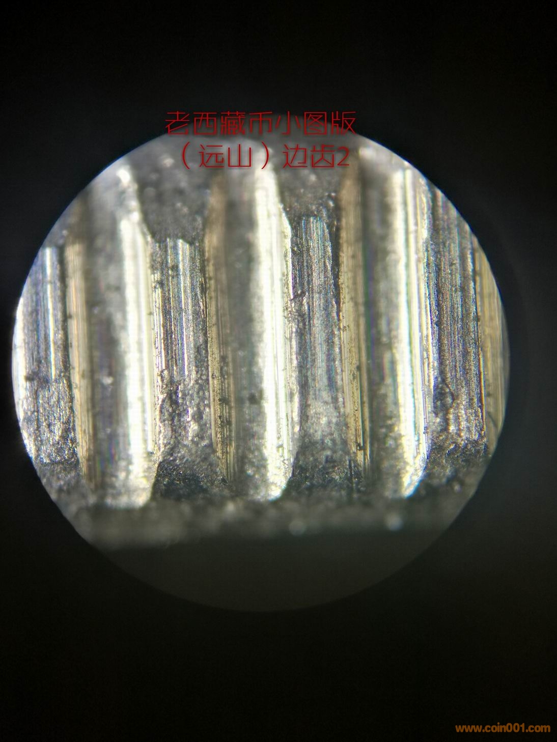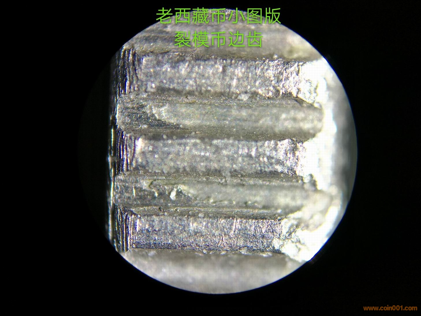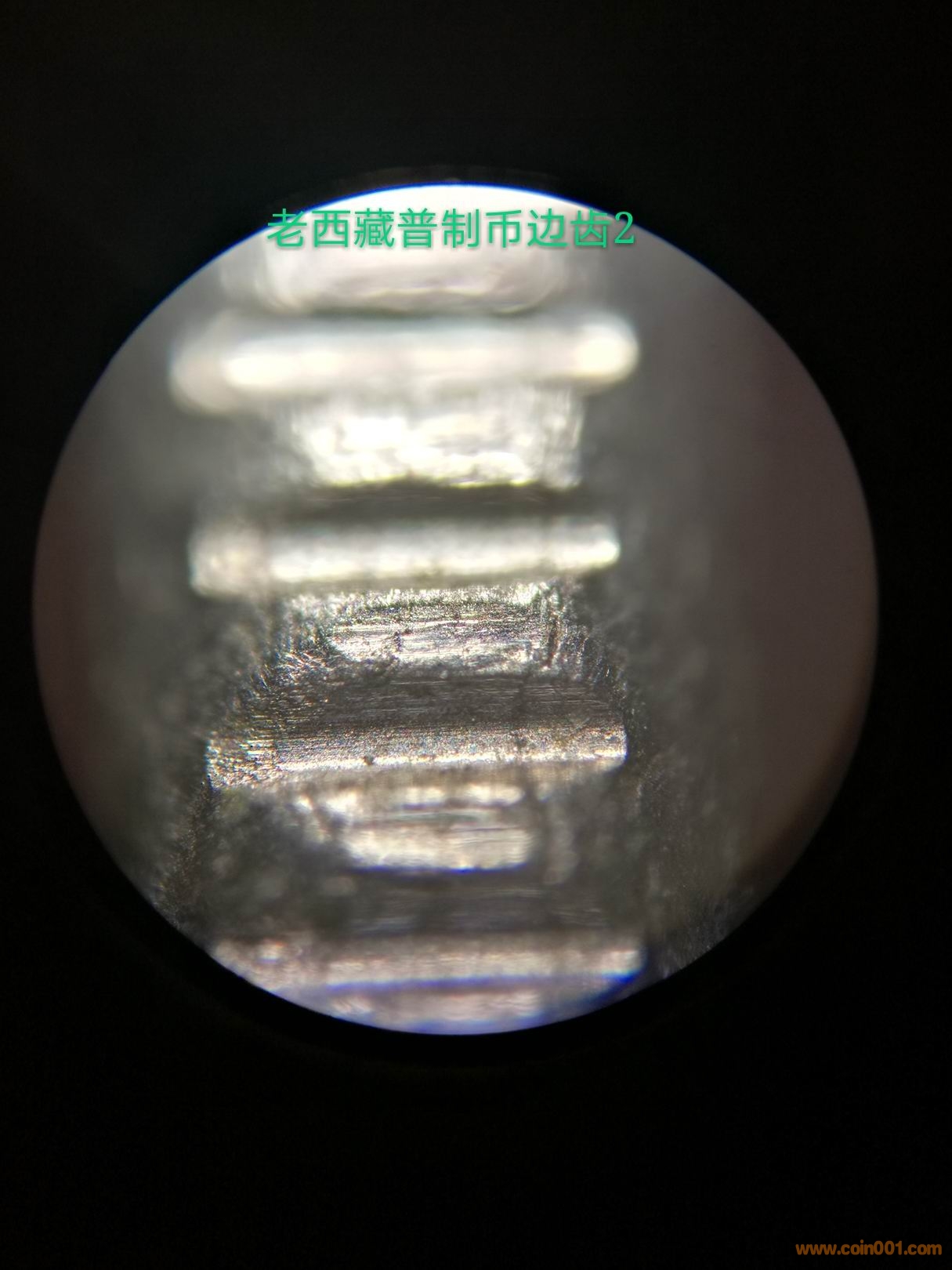 造幣廠在試機(jī)壓幣的時(shí)候,臨時(shí)調(diào)配模圈(或是舊模),很正常。但從小圖版原光幣邊齒的拍攝圖片看(圖9、圖10),所使用的模圈應(yīng)該是新模圈。