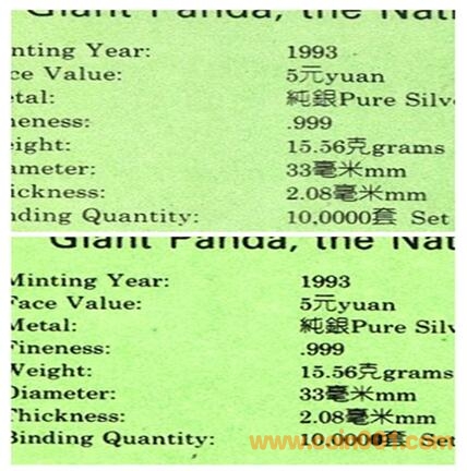 二、關(guān)注 從老馮這里買到的這套大熊貓銀銅紀(jì)念幣,是裝在一個(gè)紅底藍(lán)面的絨盒中的。紅色底座上的兩處圓形的嵌座,各放一枚1993年的大熊貓5元面值銅質(zhì)流通紀(jì)念幣和1993年5元面值的熊貓1/2盎司的銀幣。綠色的硬紙證書上標(biāo)明,這種套裝的裝幀量為100000套。絨盒外還有一個(gè)白色的紙?zhí)祝執(zhí)咨鲜菭C金的中國人民銀行行標(biāo)和中英文的中國金幣總公司。值得注意的是,白色紙?zhí)缀途G色證書上的中文,均為繁體字,而絨盒內(nèi)頁上的中文,則是國內(nèi)通用的簡體字。