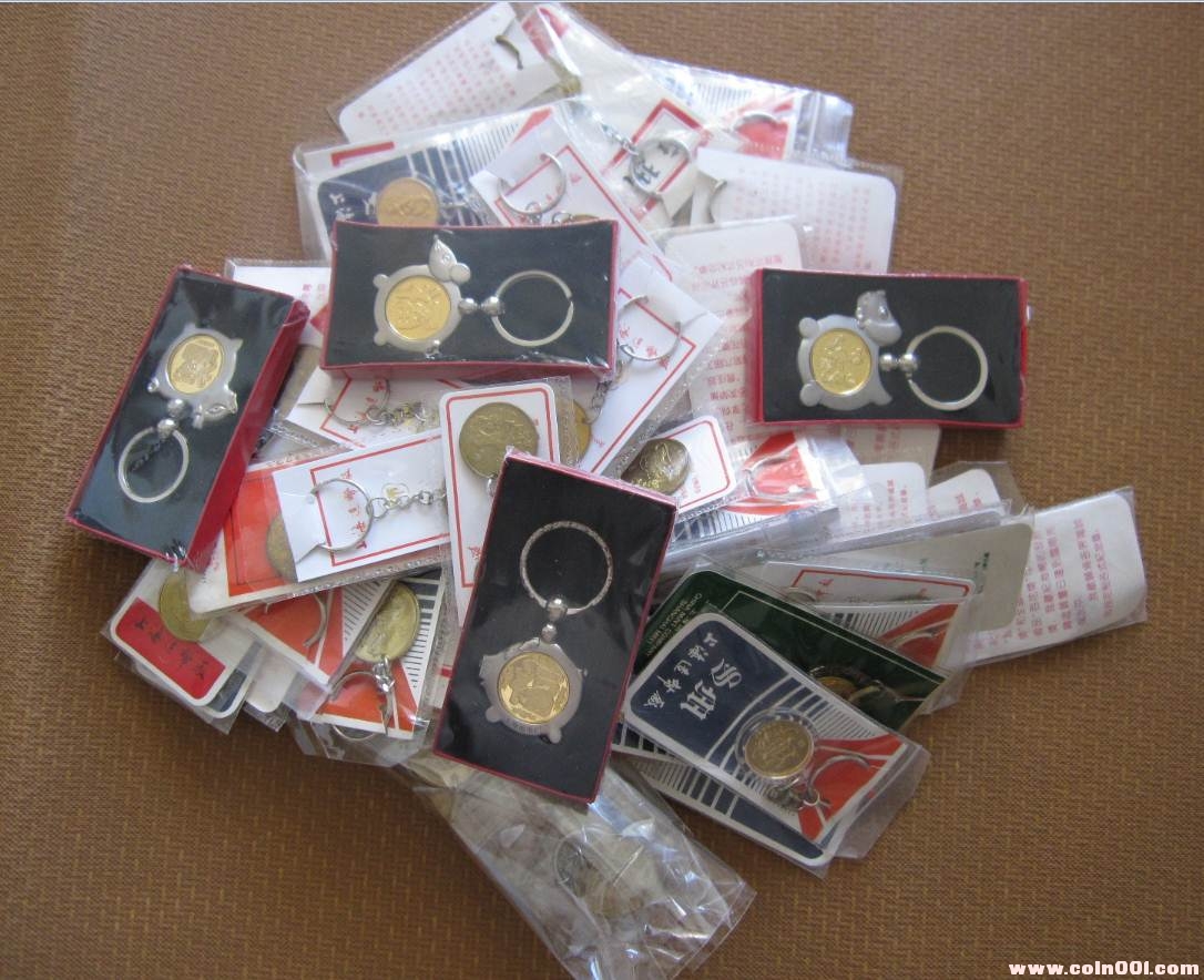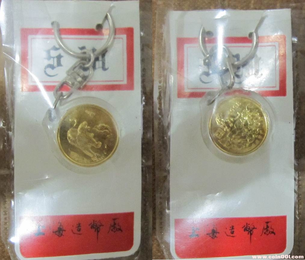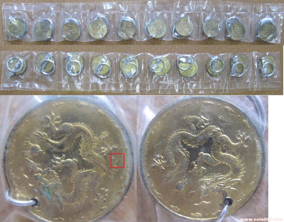 之前有人猜想帶“F”的可能是上幣廠分廠生產(chǎn)的,“F”代表是分廠的“分”字的拼音。但是我有一版上幣一輪88年龍的30mm的鑰匙圈,整版的少見。我發(fā)現(xiàn)在整版的鑰匙圈中,既有帶“F”的,又有不帶“F”的,見圖14-2 。這樣基本可以判斷,無論帶不帶“F”的都是一個地方生產(chǎn)的,帶“F”的不可能是某一個廠專門生產(chǎn)的。至于為什么會在開模具的時候,制造出帶“F”和不帶“F”兩種版別,目前還是一個迷,有待進一步的研究。