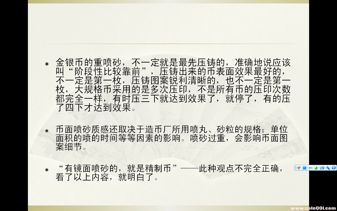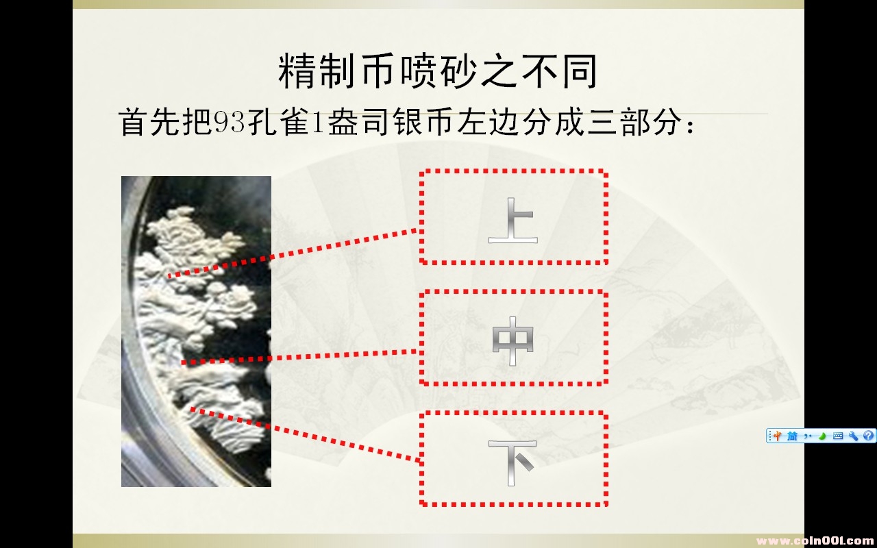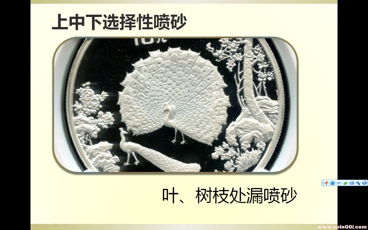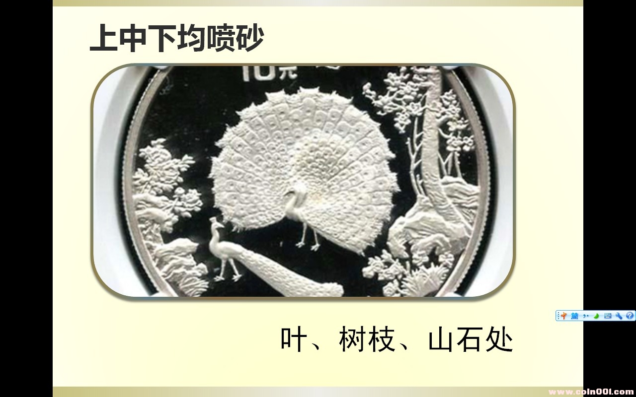 發(fā)現(xiàn)1993年1盎司孔雀銀幣靠左邊山石和樹枝處噴砂樣式多種,以下是跟朋友一起做的總結(jié),發(fā)上來和大家一起探討.