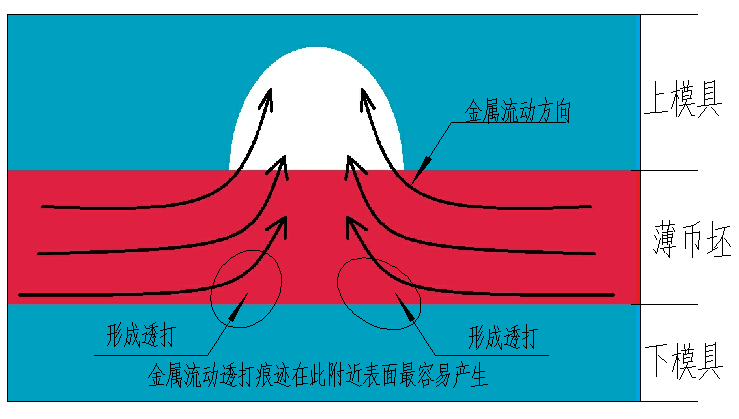 2、幣坯金屬橫向流動(dòng)量和流動(dòng)速率,金屬量和速率越大,透打痕跡表現(xiàn)越明顯。