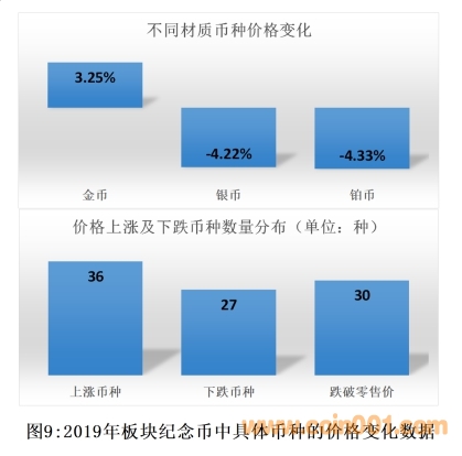 如圖9所示:①在2019年板塊的紀念幣中,市場交易價格:金幣整體上漲3.25%,銀幣整體下跌4.22%,鉑幣下跌4.33%。②在2019年板塊的63種紀念幣中,市場交易價格上漲的幣種36種,市場交易價格下跌的幣種27種。③在價格上漲和下跌的幣種中,到2020年6月底,共有30個幣種跌破零售價。