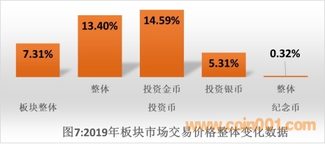 如圖7所示:2019年板塊市場交易價格整體上漲7.31%。其中投資金幣整體上漲14.59%,投資銀幣整體上漲5.31%,紀念幣整體上漲0.32%。