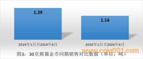在新冠肺炎疫情沖擊下,國內(nèi)消費市場在短期內(nèi)受到較大影響,30克普制熊貓金幣的銷售也未能獨善其身。如圖3所示,2020年1月至6月30克普制熊貓金幣實現(xiàn)銷售1.14噸,與去年同期相比下降11.21%。