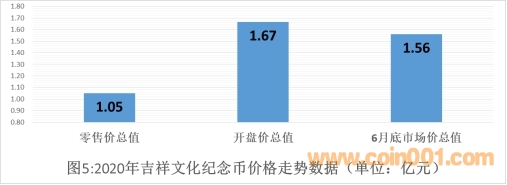 如圖5所示,“2020吉祥文化金銀紀念幣”零售價總值1.05億元。上市開盤交易的市場價總值1.67億元,與零售價總值相比平均高開58.54%;到6月底市場價總值1.56億元,從高點回落6.34%,但仍高于零售價總值46.49%。