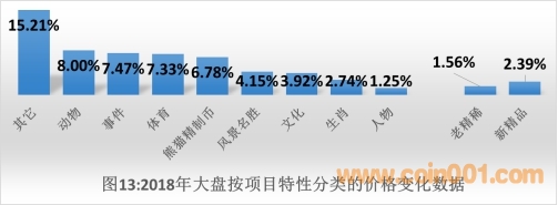 如圖13所示:①2018年大盤紀念幣按項目特性分類的各個板塊,市場交易價格的平均價格均在上漲,其中上漲幅度最大的是“其它”板塊,上漲幅度最小的是“人物”板塊。②在市場普遍關注的紀念幣板塊中,“老精稀”板塊上漲1.56%,“新精品”板塊上漲2.39%。③數(shù)據(jù)顯示,在2018年大盤紀念幣按項目特性分類的各個板塊中,市場交易價格的變化幅度似乎與這些紀念幣的“料價比”存在