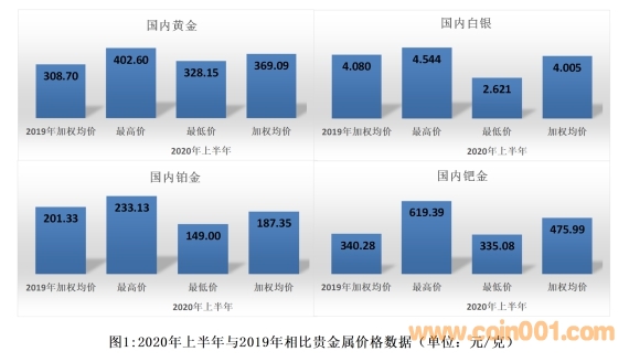 (四)國內(nèi)鈀金價格最高報619.39(元/克),最低報335.08(元/克),加權(quán)均價報475.99(元/克);2020年上半年與2019年相比加權(quán)均價上漲39.88%。