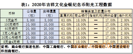 如表1所示,“2020吉祥文化金銀紀念幣”按央行公告足額發(fā)行。從發(fā)售渠道的占比看:直屬機構(gòu)為63%,商業(yè)銀行為18%,特許經(jīng)營為17%,海外機構(gòu)為2%。