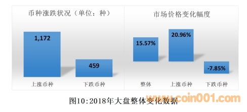 如圖10所示,在2018年大盤中市場價總值上漲15.37%。其中市場交易價格上漲幣種1,172種,整體上漲幅度20.96%;市場交易價格下跌幣種459種,整體下跌幅度7.85%。