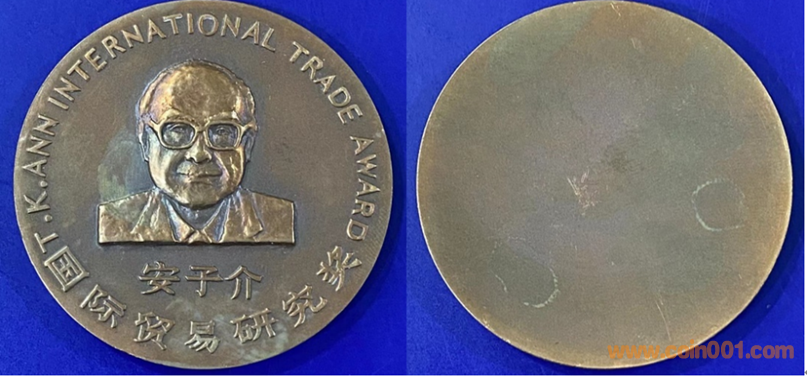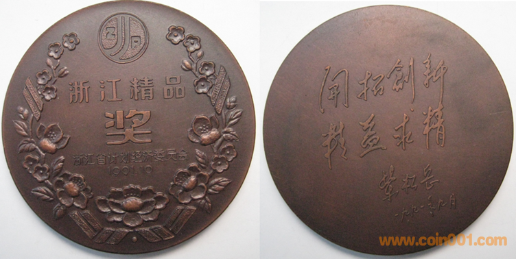 1991年上幣制造,紫銅上色60MM。正面“浙江精品獎”文字,反面為主題文字。