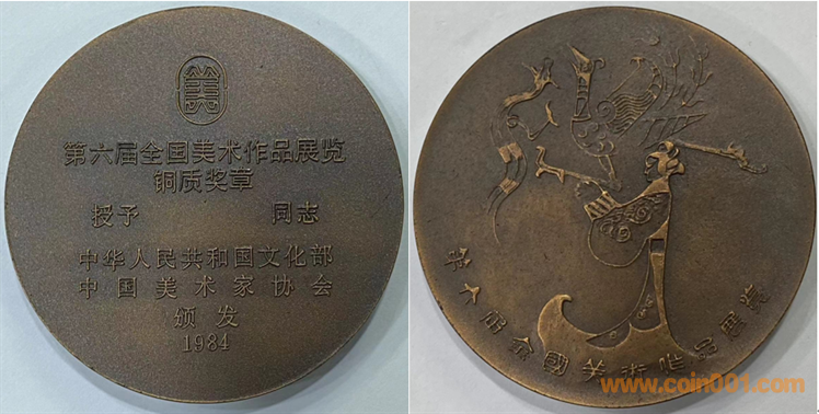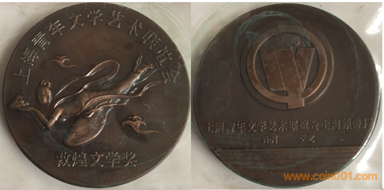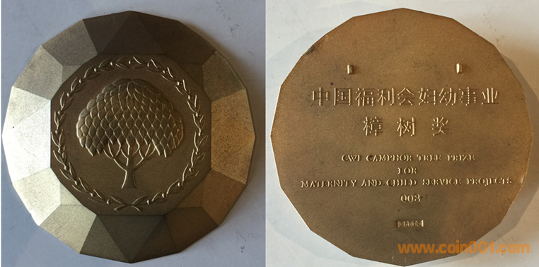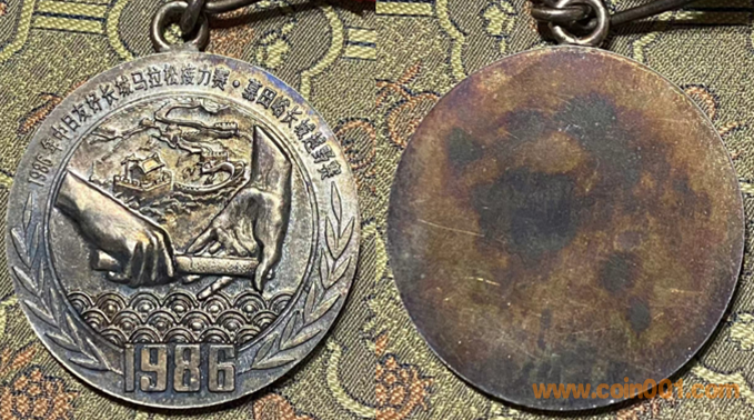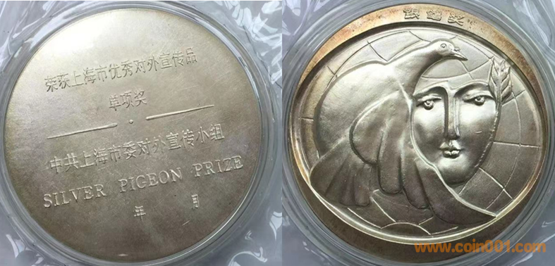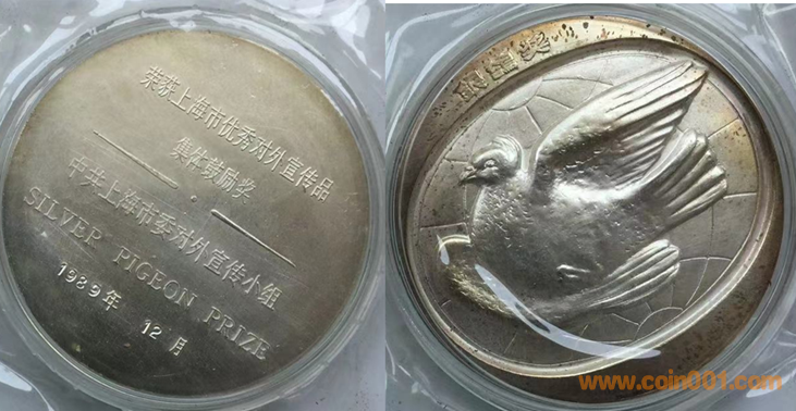 1989年上幣制造,紫銅鍍銀普制70MM。正面為主題文字,反面(單項獎)和平鴿懷抱少女、(集體獎)和平鴿。