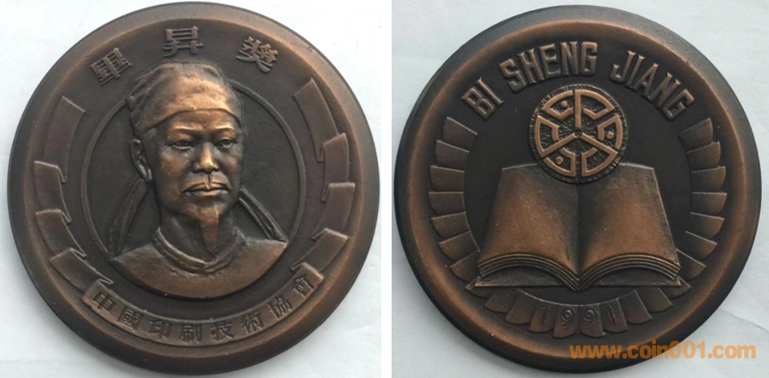 1991年上幣制造,紫銅上色60MM。正面為畢昇頭像,反面為書本圖案。