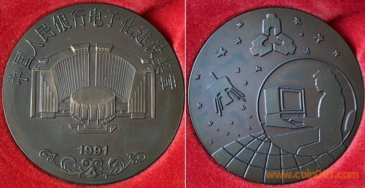 19. 中國人民銀行電子化獎?wù)?br />1991年上幣制造,紫銅上色60MM。正面為行大樓,反面為電子科技裝飾圖案。