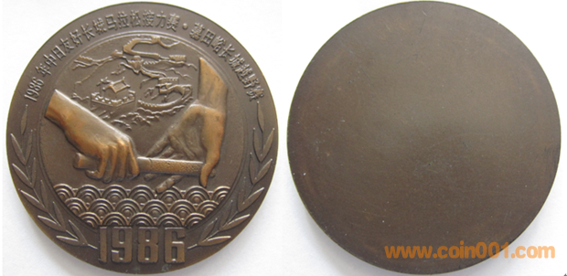1989年上幣制造,紫銅上色60MM。正面為主題文字,反面為雙手托舉徽標(biāo)。