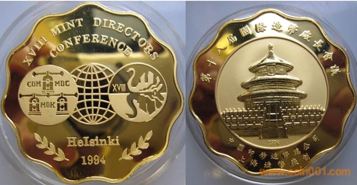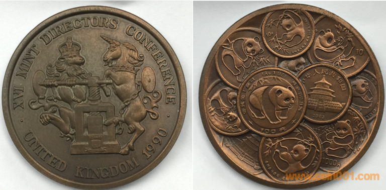 1990年上幣制造,紫銅上色。正面為國際造幣會議會徽,反面為熊貓疊幣圖案。
