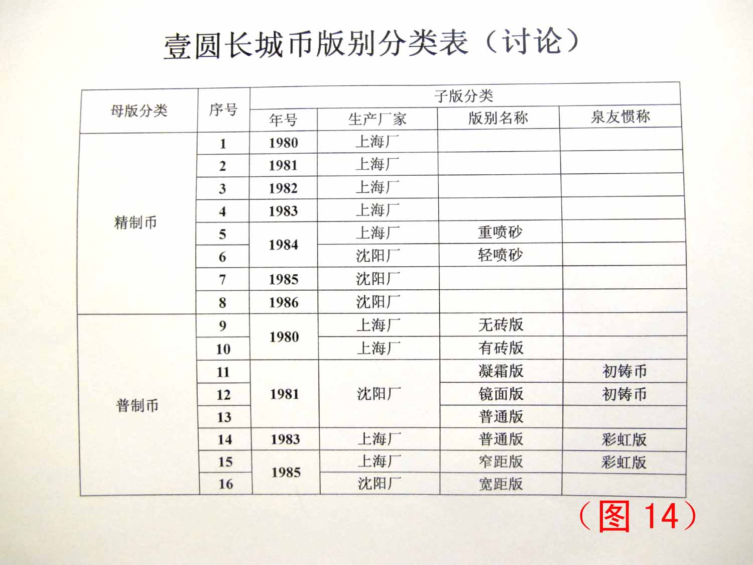 通過以上分析,本文建議,7個年份的壹圓長城幣可細(xì)分出16個版別。具體情況如下:(見圖14)