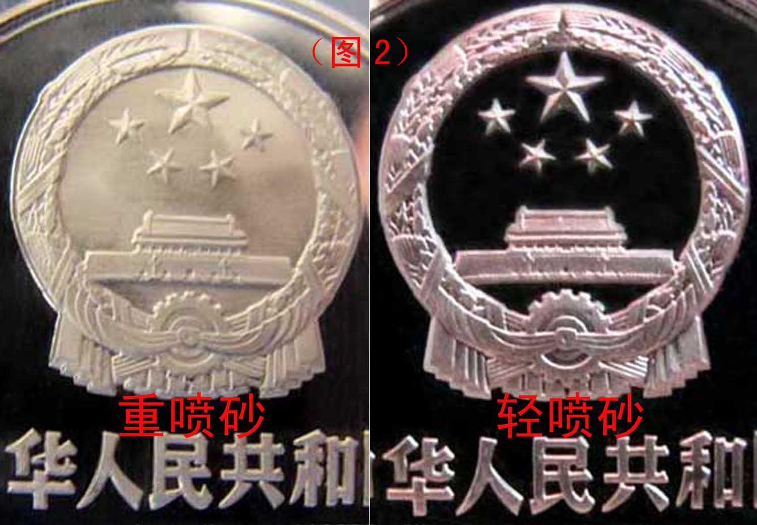 (二)精制幣與精制幣。即便都是采用了精制加工工藝,但由于生產(chǎn)廠家的不同,在各年份的精制壹圓長城幣中,也存在著明顯的特征差異,其主要表現(xiàn)在噴砂程度不同上,即:有“重噴砂”、“輕噴砂”之分(見圖2)。經(jīng)實(shí)物對比,我們不難發(fā)現(xiàn),造成噴砂程度不同的主要原因是生產(chǎn)廠家不同。上海造幣廠生產(chǎn)的精制幣噴砂密度相對較大,屬“重噴砂”(但上海廠鑄造的精制幣也有輕噴砂現(xiàn)象,只是在量上相對而論);沈陽造幣廠生產(chǎn)的精制幣噴砂密度相對較小,屬“輕噴砂”。這種差異在兩個廠家生產(chǎn)的1984年精制幣上,得以最直觀的體現(xiàn)。至于“重噴砂”、“輕噴砂”兩者孰優(yōu)孰劣,只能由廣大泉友自己去評判。