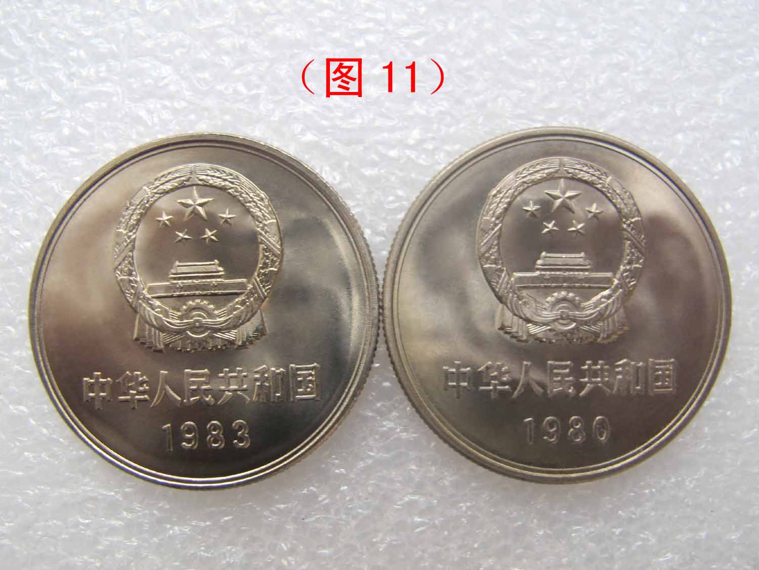 (五)83年壹圓長城幣。1983年壹圓長城幣由上海造幣廠生產(chǎn)(見圖10),卷幣為牛皮紙全封閉手工包裝。幣的背面長城圖案上方的凹入部分,也有國徽透打形成的彩虹狀痕跡,背面凹入部分的片狀鑄造紋理較輕,無鏡面效果,幣的特征與1980年有磚版基本一致。1983年壹圓長城幣繼承了上海廠的風(fēng)格,可謂是1980年有磚版壹圓長城幣的翻版(見圖11)。