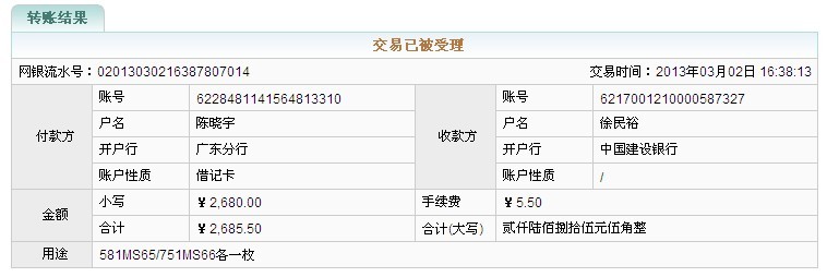 引用 引用第11樓英紅九號于2013-03-02 16:30發(fā)表的 :電聯(lián)確認(rèn)581和751各一枚,串號和總價見站內(nèi)信,請賣家跟貼確認(rèn),我即劃款,謝謝!